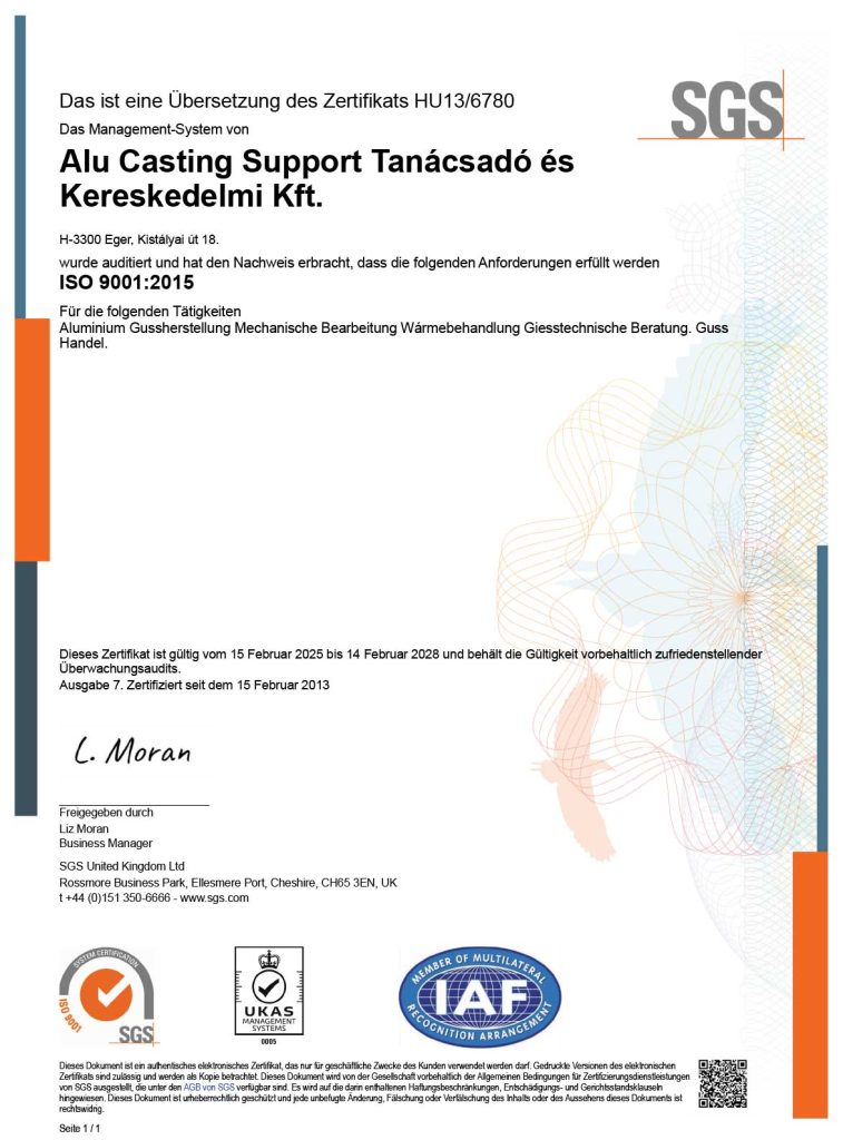 Unsere Firma Alu Casting Support Kft. hat ihre Tätigkeit im Jahr 2011 in Eger aufgenommen, zunächst mit 5 Mitarbeitern. In den letzten 10 Jahren ist unser Umsatz stetig gewachsen und wir beschäftigen derzeit 35 Mitarbeiter. Wir gehören zu den 50 führenden Unternehmen des Kreises Heves.